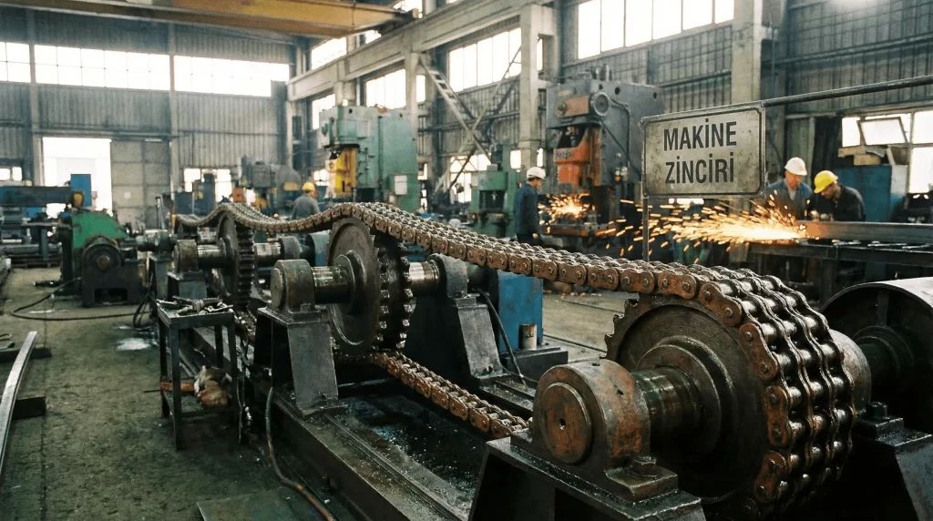 Makine zinciri, endüstriyel sistemlerde gücün veya hareketin bir milden diğerine kayıpsız aktarılmasını sağlayan, genellikle metal baklaların mafsallı bir yapıda birbirine eklenmesiyle oluşan yüksek mukavemetli bir güç aktarım elemanıdır. Bu bileşenler, özellikle kayış kasnak sistemlerinin yetersiz kaldığı ağır yük ve yüksek tork gerektiren durumlarda, dişlilerle tam senkronize çalışarak mekanik enerjiyi kinetik enerjiye dönüştürür. Üretim hatlarının kesintisiz işleyişi için kritik bir rol üstlenen bu zincirler, doğru seçildiklerinde enerji verimliliğini maksimize ederken bakım maliyetlerini ciddi oranda düşürür.